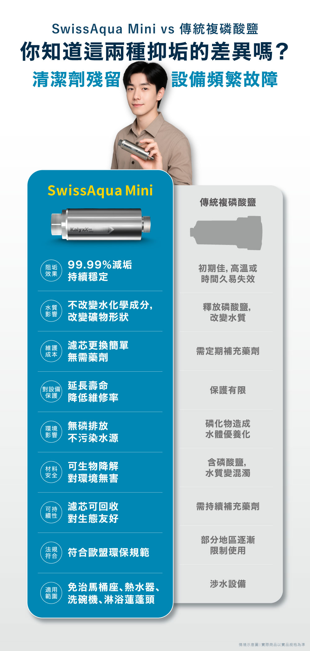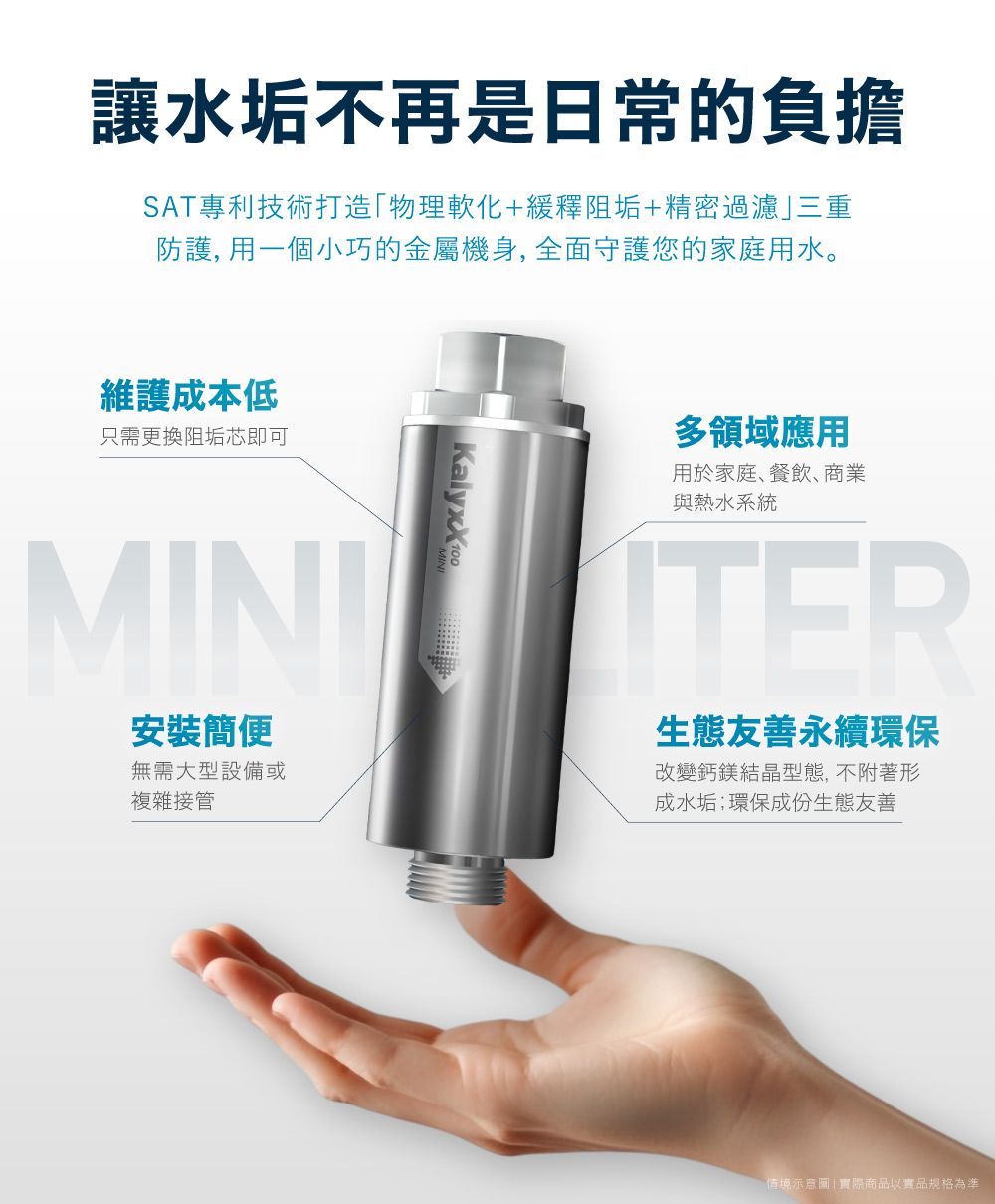 雙效抑垢阻絕結晶,精密過濾攔截雜質,延長設備使用壽命,免插電免排水體積輕巧,瑞士SAT創新複合科技。